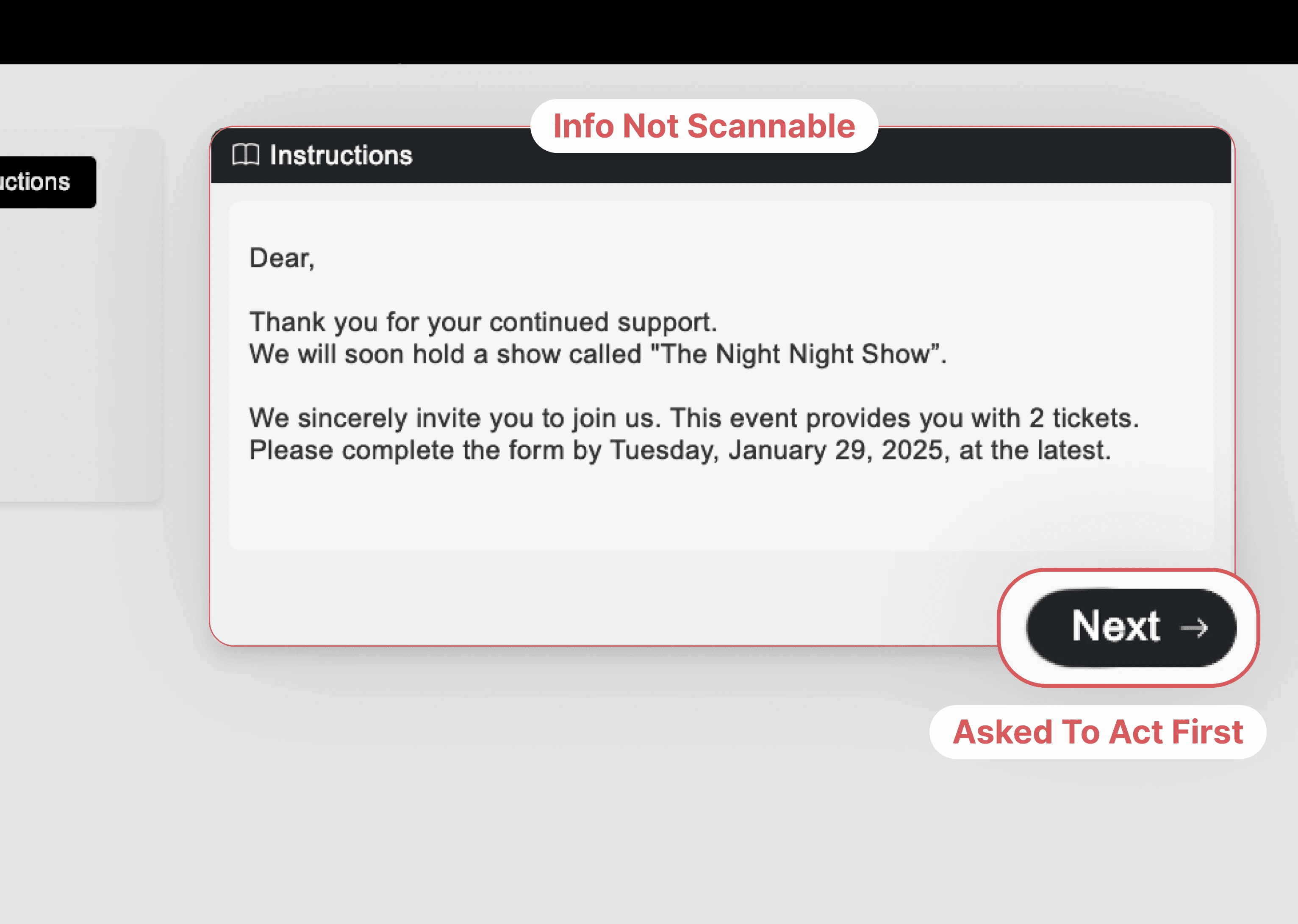 Guests couldn’t tell what they were confirming before clicking “Next,” which led to hesitation and incorrect responses.
