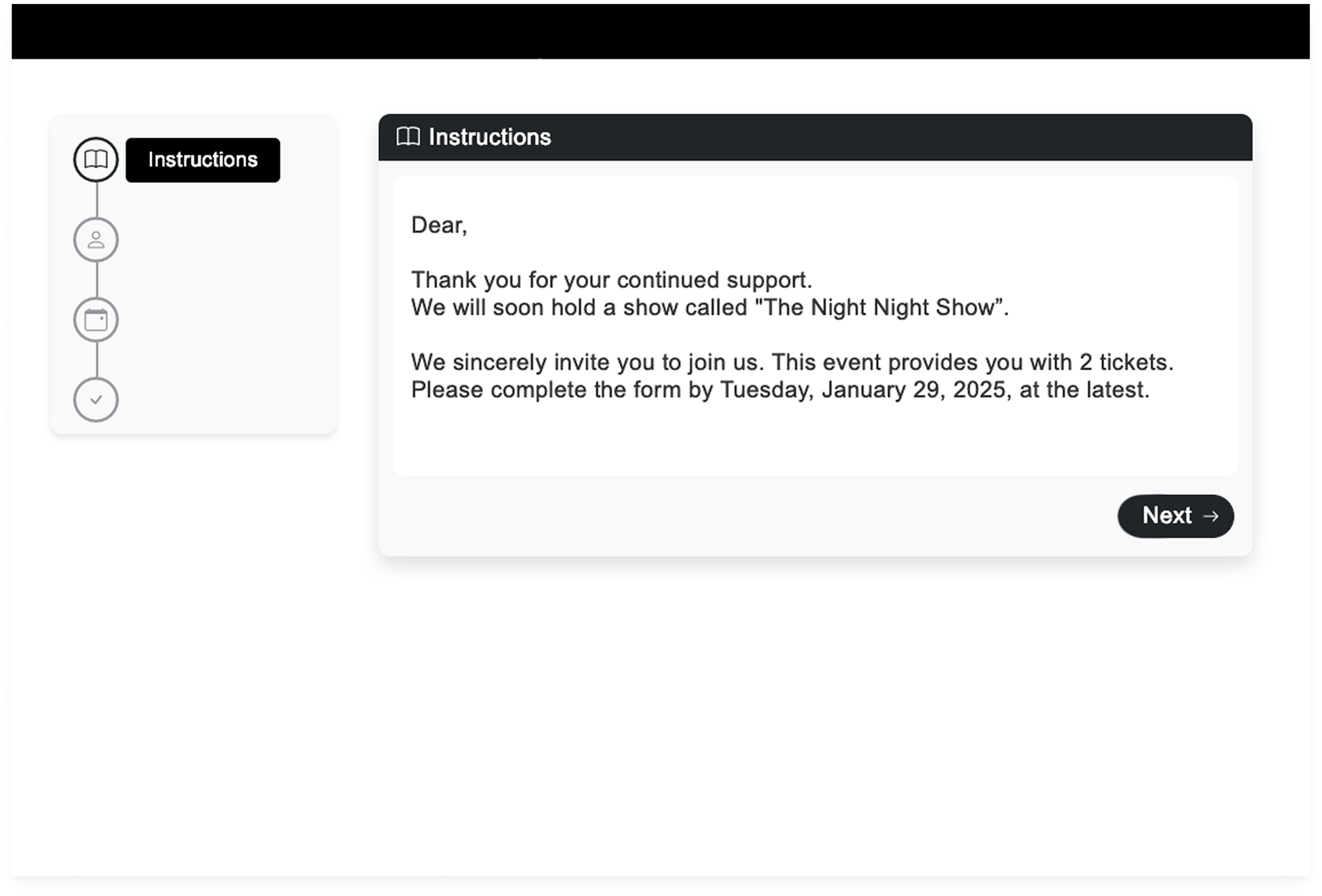 Guests see a “Next” button before they know what they’re confirming.